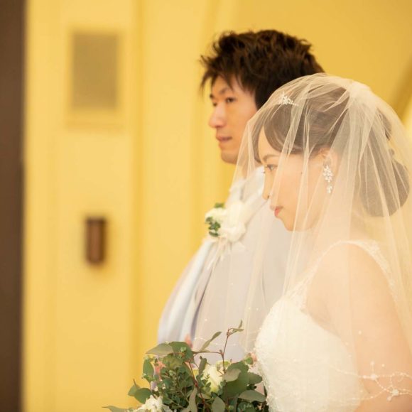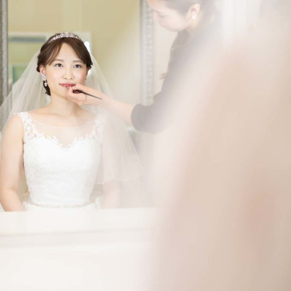 皆さま、こんにちは。 赤坂ル・アンジェ教会ヘアメイク担当でございます。 今回はヘアメイクチェンジレポートです♪お支度が仕上がったばかりの緊張の一枚・・・ 前髪はすっきりとトップやサイドも艶感をだした クラシカルなスタイルがティアラにぴったりですね!