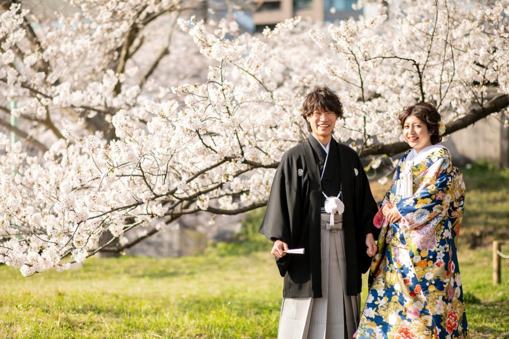 さらに時間帯によっては綺麗な光が差し込んで 素敵な雰囲気を演出します。 桜の咲く時期は人が多く 素敵なお衣裳を着たおふたりは 道行く人の目にも留まり 少し照れ臭く感じる方もいらっしゃるかもしれませんが それもまたいい思い出になると思います。 使いたいグッズなどあれば是非お持ちくださいね。 前撮り当日は楽しんで撮影しましょう♪