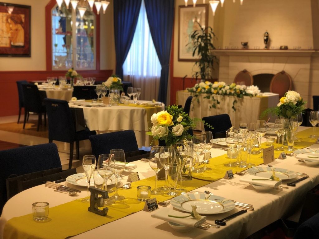 白のテーブルクロスの中央にランナーというクロスをひくと また会場の雰囲気が変わります♪ 黄色だと一気に明るい印象をあたえるので 春夏にオススメです! 元気なイメージで気分も上がるような会場装花ですね☆