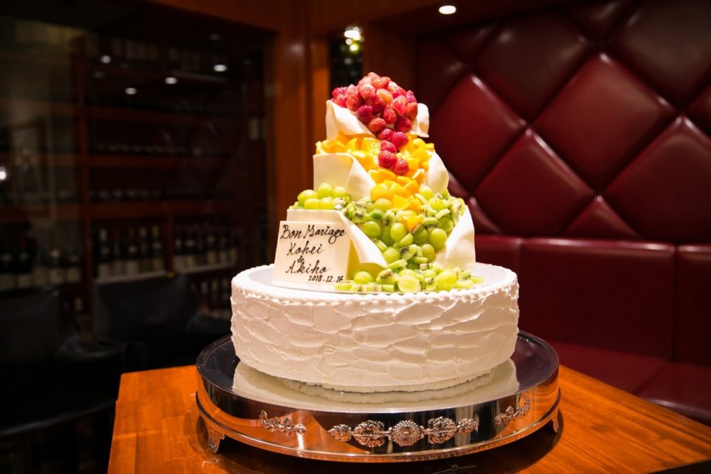 パーティーレポートをご覧いただきありがとうございます! 紫陽花の花が雨に映える季節となりましたね(^^) 皆さまはいかがお過ごしでしょうか? さて、今回はご披露宴に外せない 【ウエディングケーキ】について紹介したいと思います。 たくさんのフルーツが乗った大きなウェディングケーキ。 新郎新婦を華やかに飾る ご披露宴には欠かせないアイテムの一つ