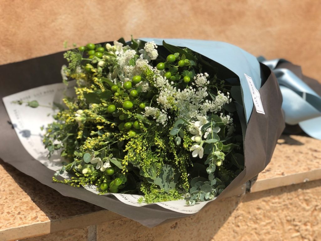 くすみグリーン系のお花を束ねています♡