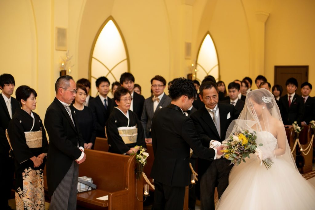 新郎様は親御様のいろんな想いを受け取り 新婦様の手を取り、 おふたりの未来を表す祭壇を共に歩んでいかれ