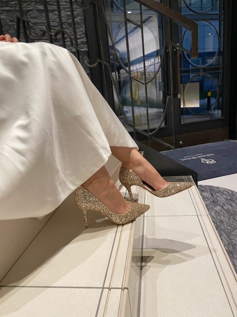 今回は、花嫁様のご好評により 再入荷したグラマラスシューズ、 【BADGLEY MISCHKA】をご紹介します!TAKAMI BRIDAL FUKUOKAでは ニューヨーク発祥の人気グラマラスシューズブランド 【BADGLEY MISCHKA(バッジェリーミシュカ)】を 国内初の正規品販売店として 2018年から取り扱っております。 ひと粒ひと粒が輝き、花嫁様の一歩を華やかに輝かせる BADGLEY MISCHKAのシューズは パーティーシーンに最適で、 その日の花嫁様をさらに心躍らせてくれるはずです。 「シューズってドレスに隠れて見えますか?」 と、花嫁様にご質問いただきます。 確かに、立ったままの姿勢だと見えにくいです。 しかし、ご結婚式当日の花嫁様は 階段の上り下りやご入場シーンなど シューズが見える瞬間はたくさんあります! 最近では、シューズを履く瞬間のお写真や 階段での撮影で足元を見せるショットなど 細部まで凝った撮影をされる 新郎新婦様が増えてきております♪
