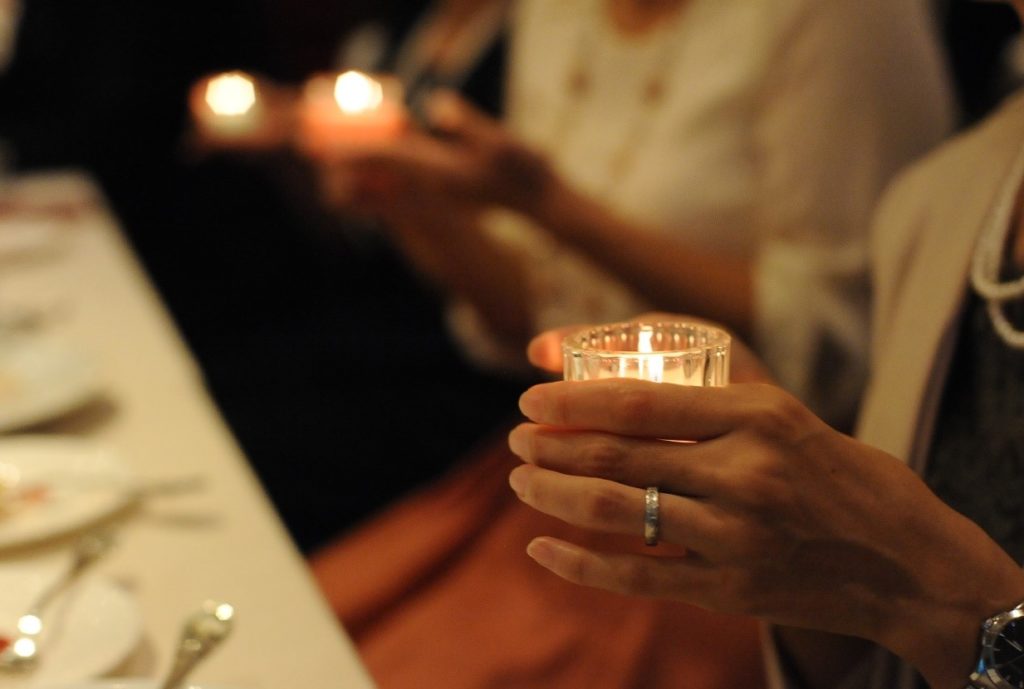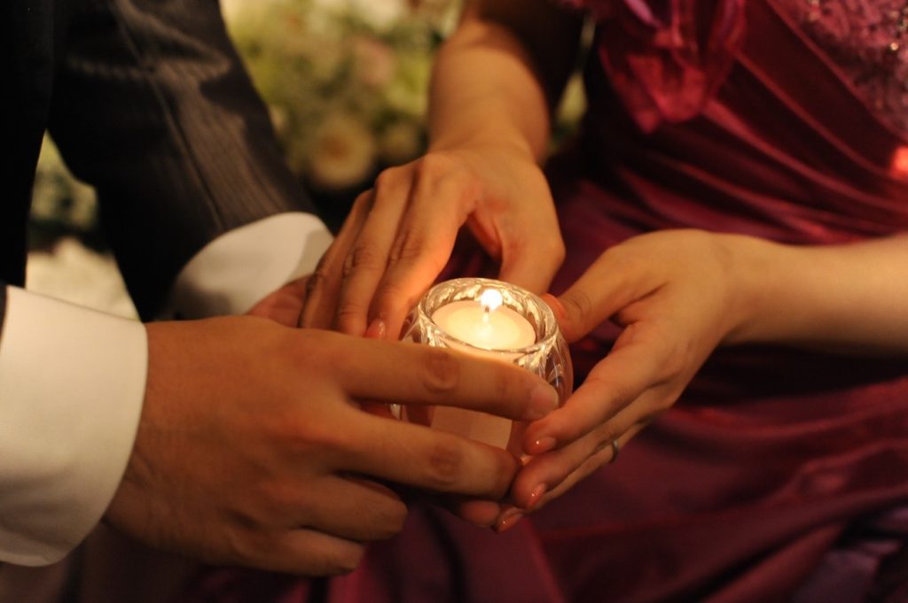 キャンドルリレーの流れとしましては まず新郎新婦様からご家族の代表者様、 もしくは親しいゲストが火種を受け取ります。 火種を受け取ったら、灯火を繋いでいきます。 新郎新婦様はゲストのテーブルに進み 各テーブルの代表のひとりに キャンドルの灯火を差し出します。 灯火ともらったら、隣の方へ順番に キャンドルの灯火をリレーのように繋いでいきます!