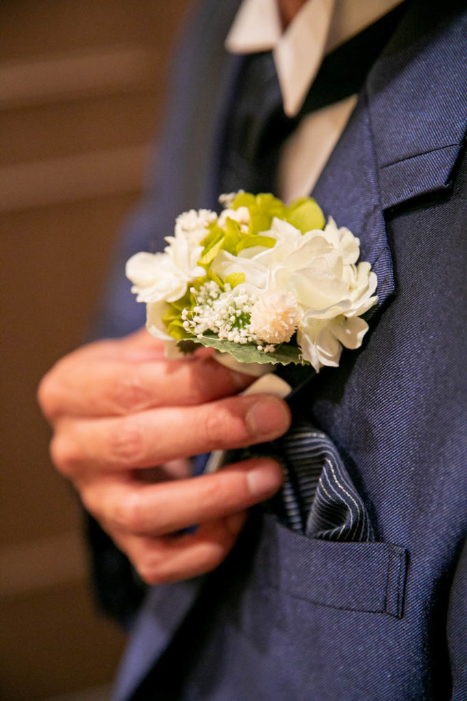 また新郎新婦様には欠かせないアイテムのひとつである ブーケ・ブートニアもオシャレにコーディネート!ブーケは【リースブーケ】と呼ばれる種類のもので 途切れることなく続く丸い形には 「永遠」