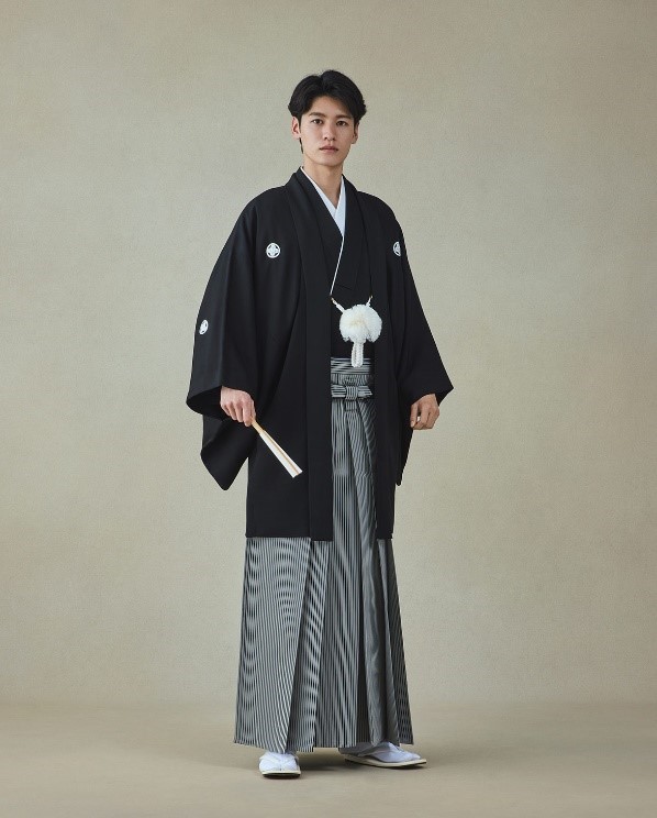 日向五つ紋を白く染め抜いた長着に縞柄の袴を合わせ、