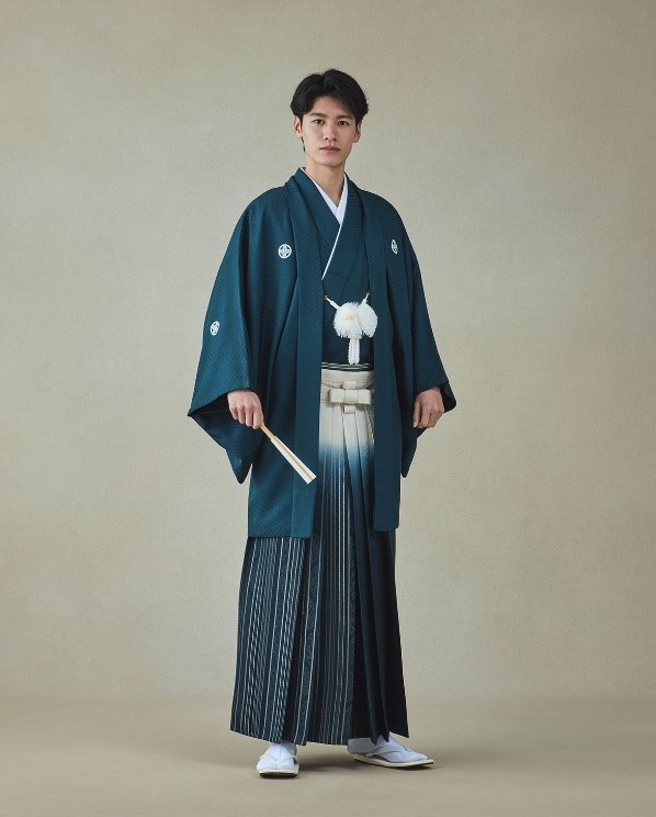 風合いのある刺子織の紋付に、深緑のぼかしを入れた袴を合わせたモダンな装い