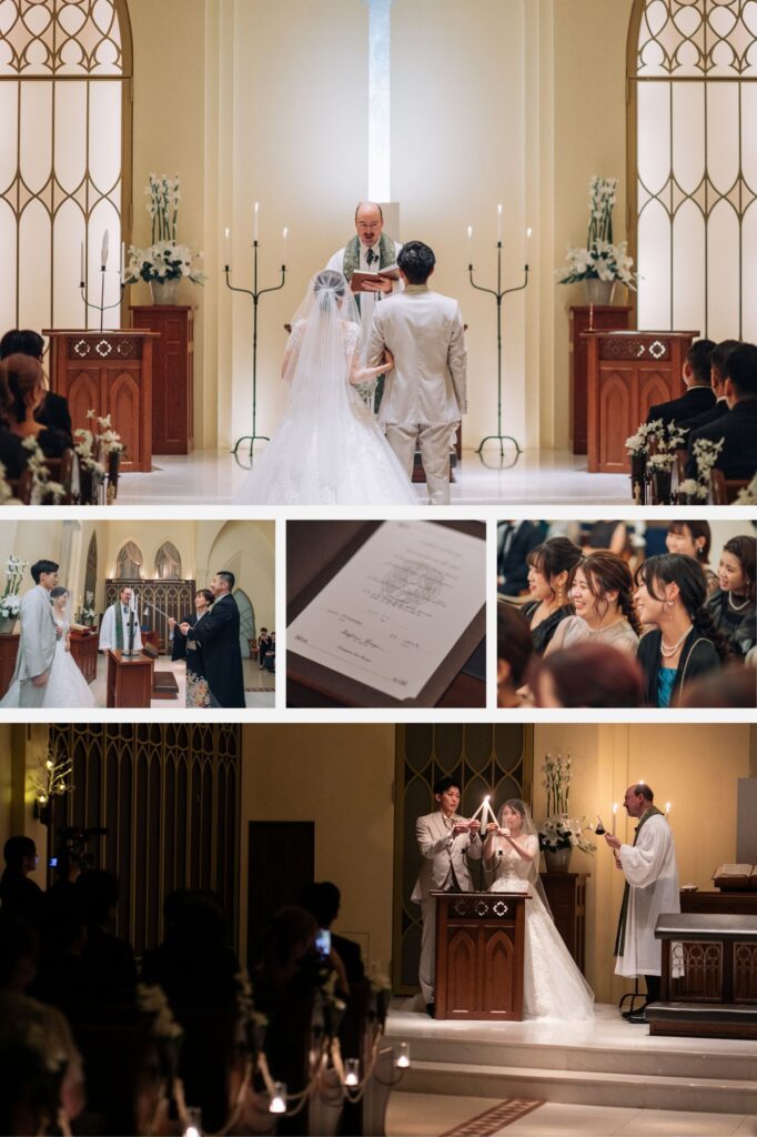 挙式では『家族との繋がり・感謝』を伝えるために『ユニティキャンドルセレモニー』を。キャンドルを灯しながら親御様からもひと言。「おめでとう、ふたりで力合わせて幸せにね」そんな言葉にふたりも自然と笑顔がこぼれます。
