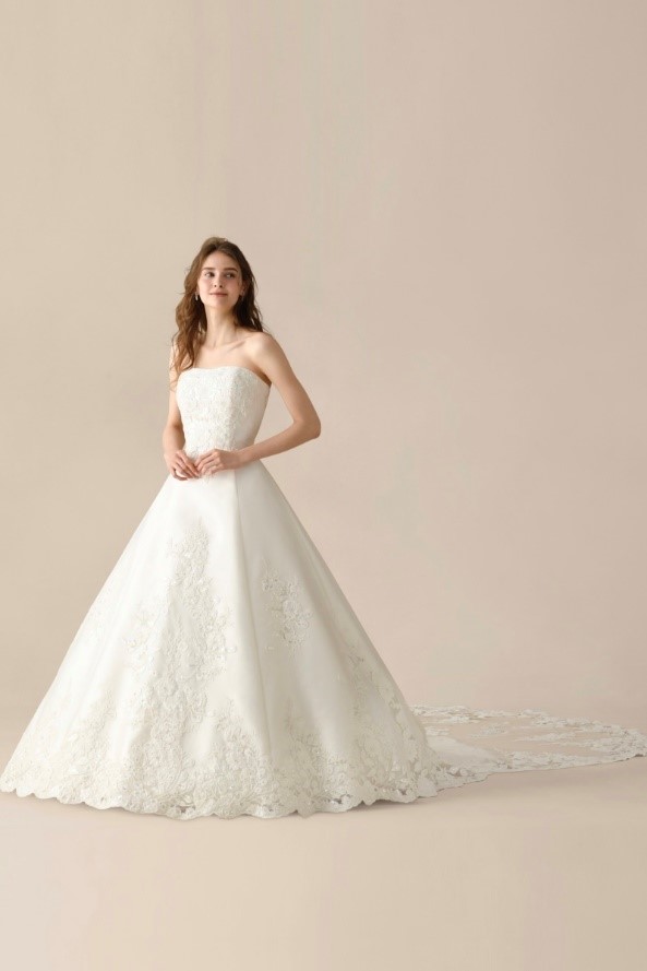 全体にギュピールレースがあしらわれた贅沢なAラインのドレス。